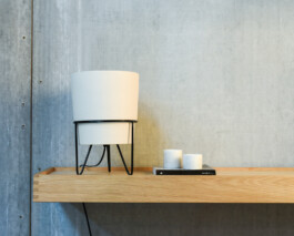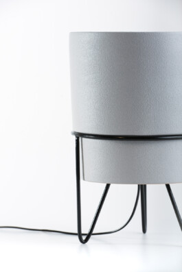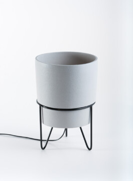 Es una luminaria de mesa inspirada en las macetas tradicionales utilizadas en balcones y jardines. Su forma simple y geométrica permite un armado fácil, donde la pantalla se apoya directamente sobre la base. Se logra un sutil contraste entre la pantalla de cerámica y las finas patas de hierro, que elevan, transmiten liviandad y permiten una iluminación indirecta.